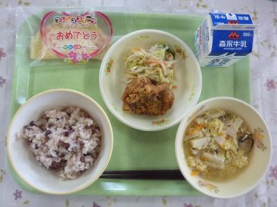 赤飯、かきたま汁、鶏肉のから揚げ、ごま和え、お祝いデザート、牛乳