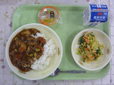 チキンカレー、野菜とたまごのサラダ、みかんゼリー、牛乳