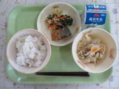 麦ご飯、若竹汁、鯖のゴマ味噌煮、おかか和え、牛乳