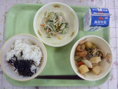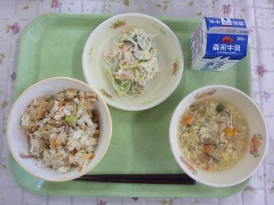 たけのこご飯、かきたま汁、春雨のマヨネーズ和え、牛乳
