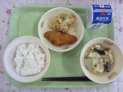 麦ごはん、みそ汁、鰆のフライ、春野菜のごま和え、牛乳