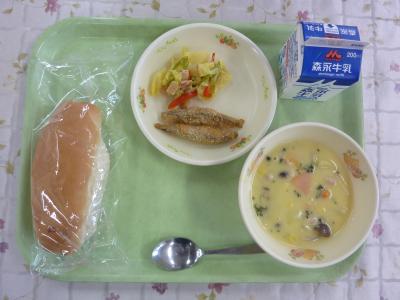 コッペパン、コーンスープ、きびなごごまフライ、野菜ソテー、牛乳