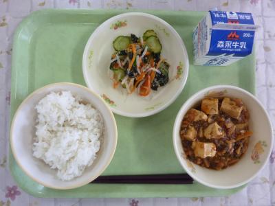 むぎご飯、麻婆豆腐、御船川のナムル、牛乳