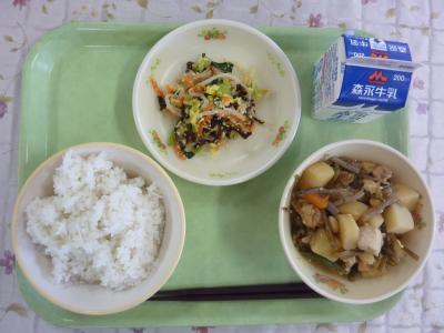 麦ごはん、肉じゃが、ごぼうマヨサラダ、ひじきふりかけ、牛乳