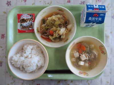 麦ご飯、根菜のゴマ汁、焼き肉風炒め、黒糖ビーンズ、牛乳
