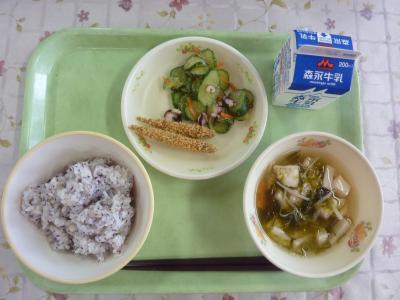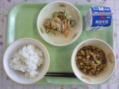 麦ごはん、大豆の磯煮、切干大根の酢の物、牛乳