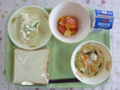 太平燕、ポテトサラダ、スイカ入りフルーツカクテル、牛乳