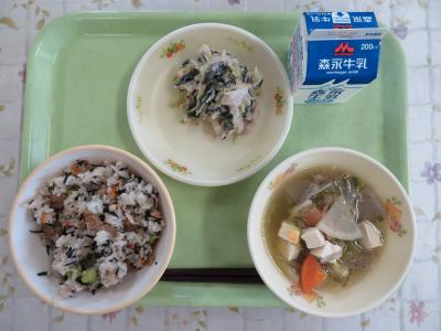 ひじきご飯、けんちん汁、御船川とささみのゴマサラダ、牛乳