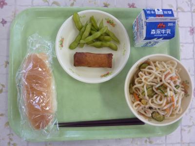 ミルクパン、冷やし中華、春巻き、えだまめ、牛乳