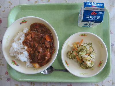 麦ご飯、御船川ともずくのスープ、鶏のさっぱり煮、かつおふりかけ、牛乳