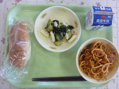 ミルクパン、なすのミートスパゲティ、シーフードサラダ、牛乳