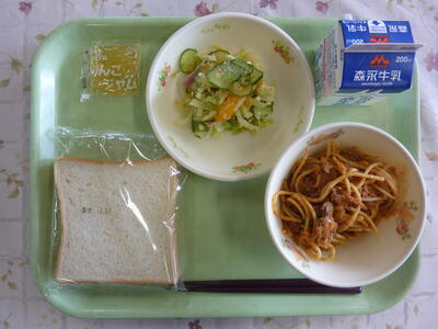 食パン、スパゲティボロネーゼ、ミックスサラダ、りんごジャム、牛乳