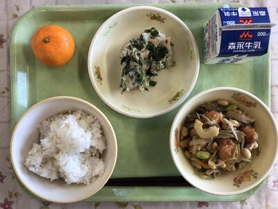 麦ごはん、大豆の磯煮、芋白和え、みかん、牛乳