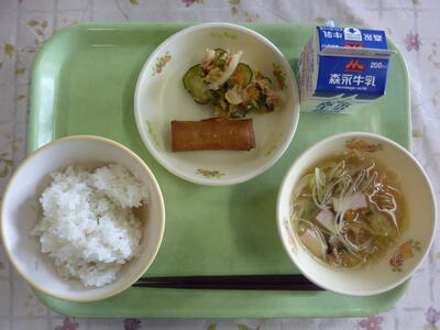 麦ごはん、汁ビーフン、春巻き、キムチ和え、牛乳