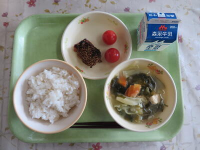 麦ご飯、キャベツの味噌汁、鶏のごまだれ焼き、ミニトマト、牛乳