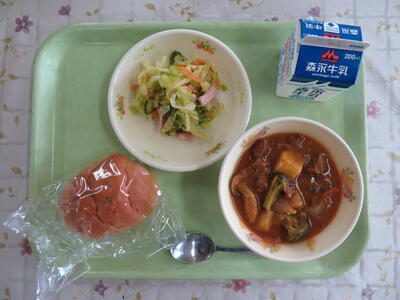ミルクパン、大豆とキャベツのトマト煮、シーザーサラダ、いきなり団子、牛乳