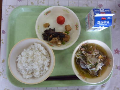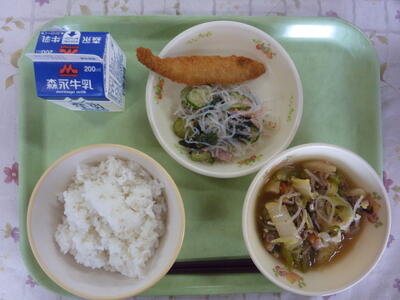 麦ごはん、にら玉汁、県産真鯛の天ぷら、チンゲン菜のサラダ、牛乳