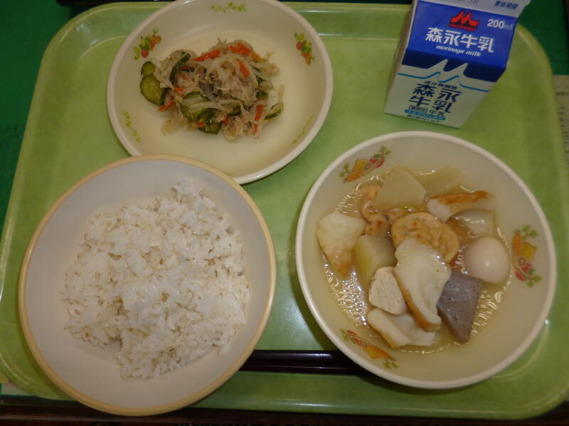 麦ごはん、牛乳、みそ煮込みおでん、切り干し大根の酢の物