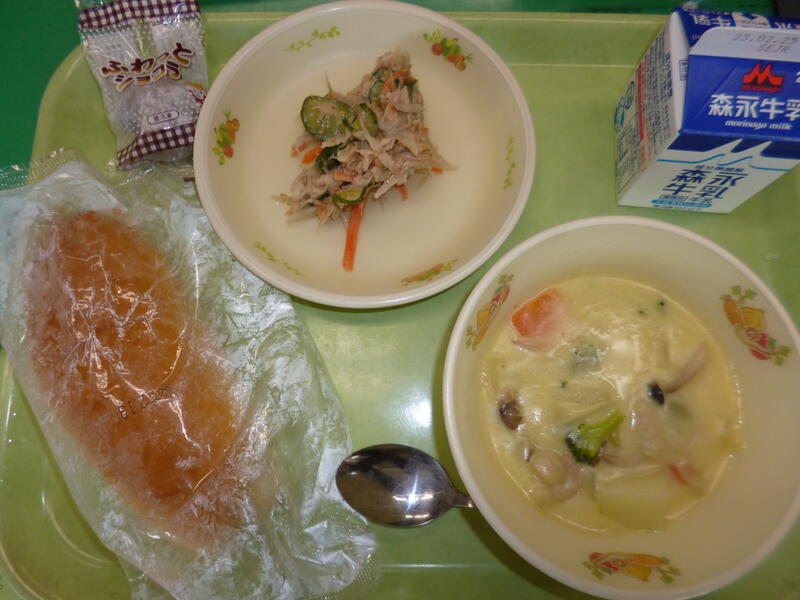 コッペパン、牛乳、クリームシチュー、ごぼうサラダ、チョコ大福