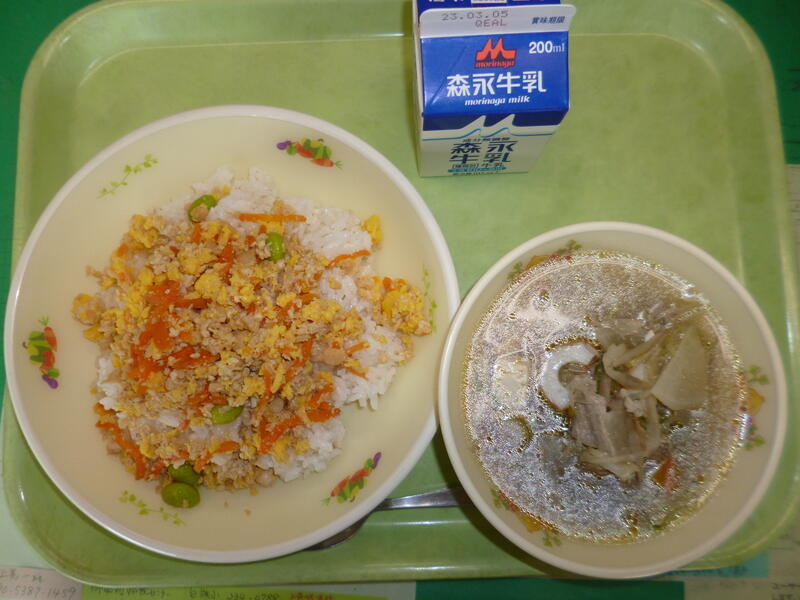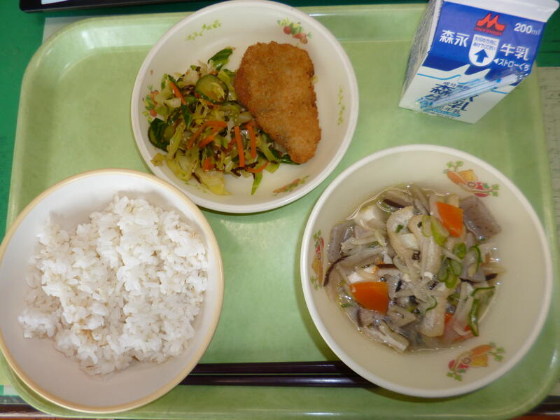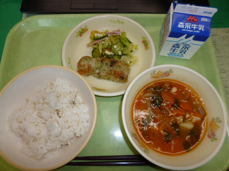 ふるさとくまさんデー(八代)麦ごはん、牛乳、トマトスープ、ちくわの磯辺揚げ、ミックスサラダ