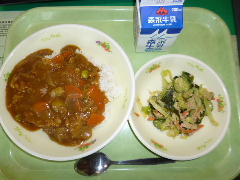 ポークカレーライス、牛乳、わかめとツナのごまサラダ
