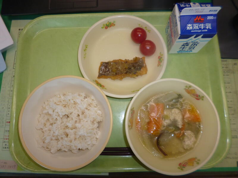 麦ごはん、手作り肉団子スープ、魚のねぎソース、ミニトマト、牛乳