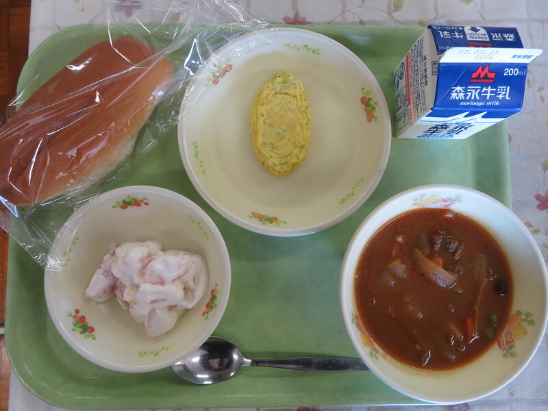 ~馬肉の日~ じゃこ菜飯、牛乳、馬肉とじゃがいものカレー煮、ひじきと卵のサラダ