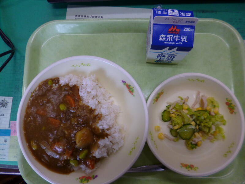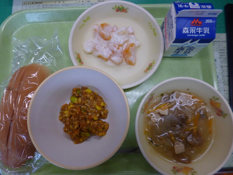 コッペパン、牛乳、オニオンスープ、カレーミートビーンズ、フルーツヨーグルト