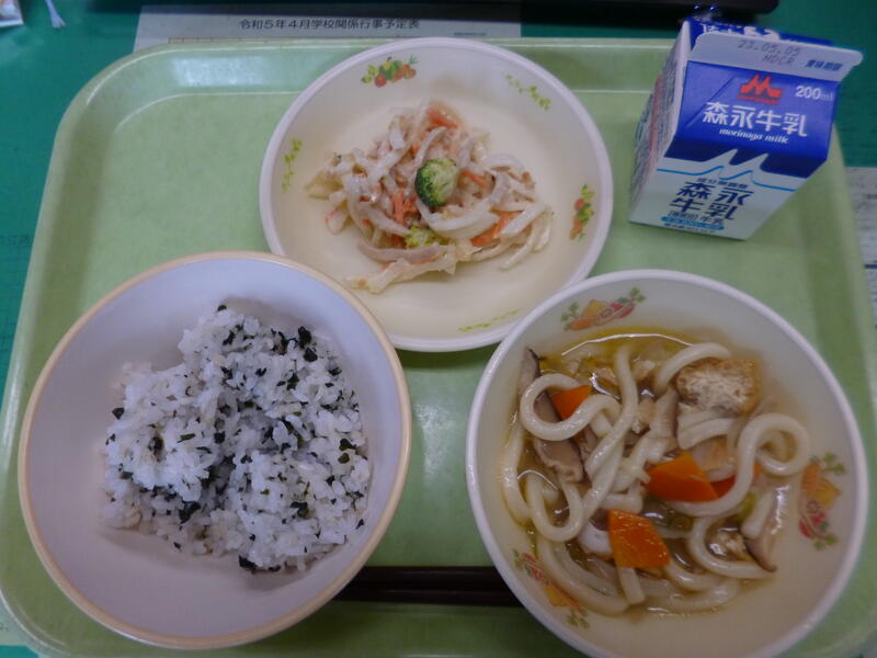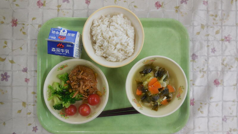 麦ごはん、牛乳、五目肉じゃが、子持ちししゃもフライ、キャベツのゆかり和え