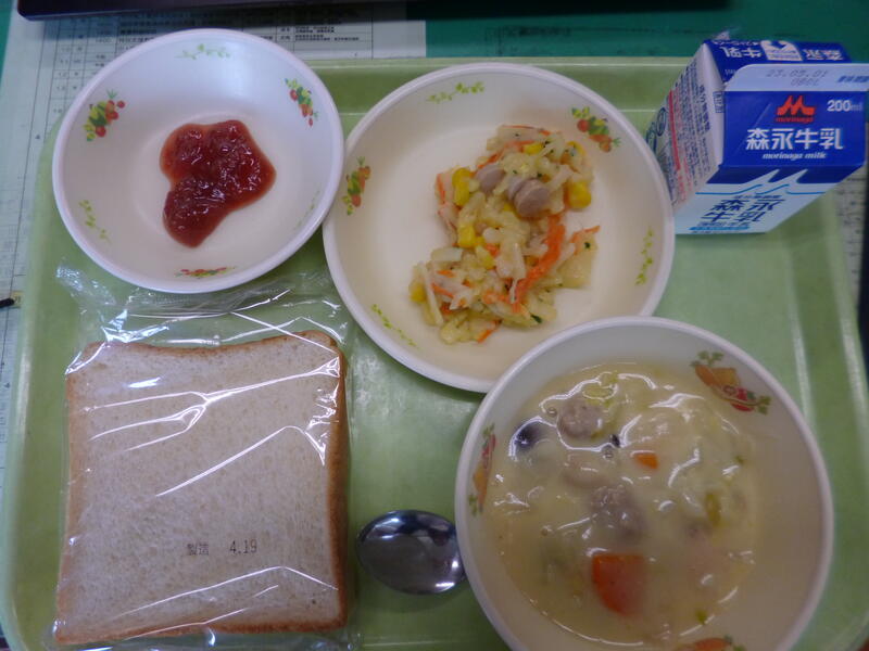 食パン、牛乳、肉団子のクリーム煮、ポテトリヨネーズ、手作りいちごジャム