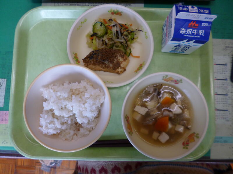 むぎごはん、牛乳、けんちん汁、サバのごまだれ焼き、ひじき和え