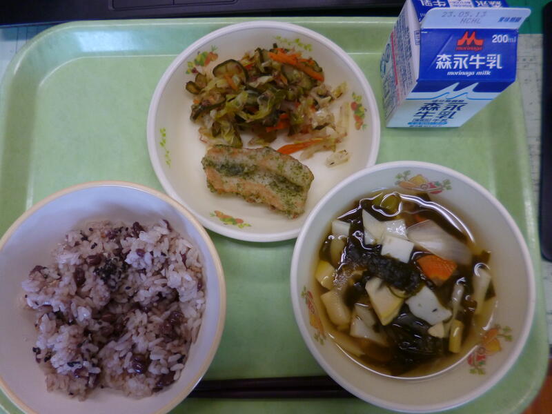 赤飯、牛乳、ちくわの磯辺揚げ、野菜のおかか和え