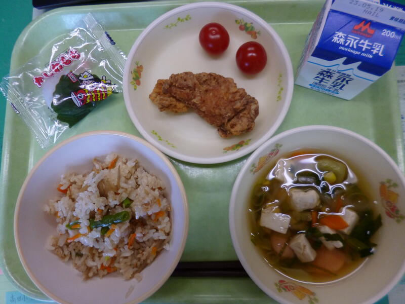 子ぎつねご飯、牛乳、彩り野菜のつみれ汁、鶏のから揚げ、ミニトマト、柏餅