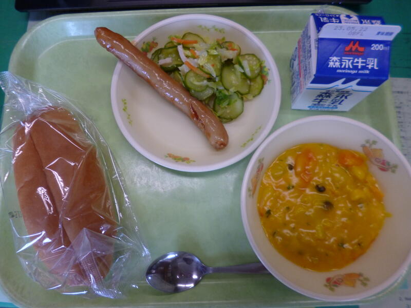 セルフドッグ(パン、キャベツのマスタードサラダ、ウインナー)、牛乳、パンプキンポタージュ