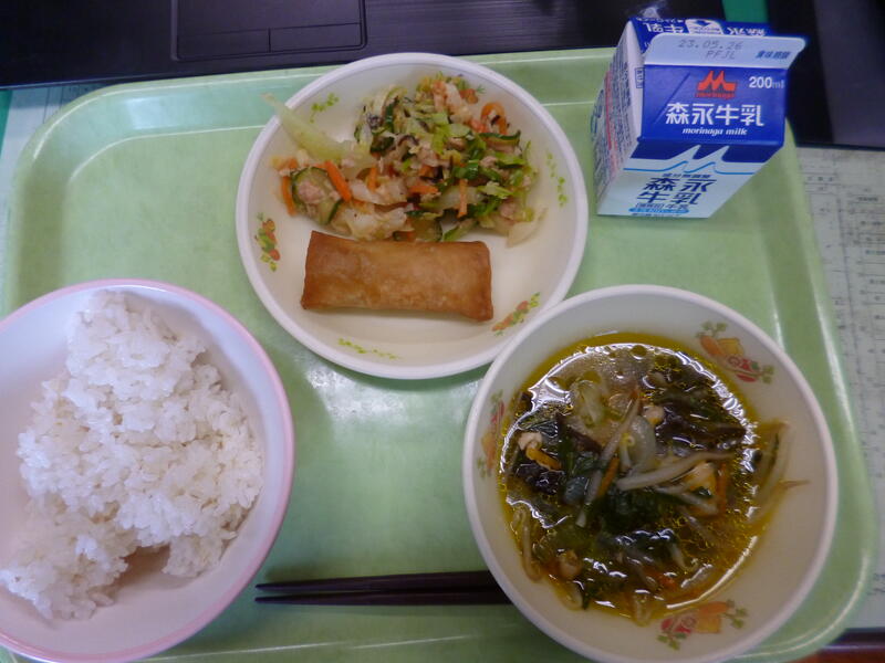 麦ごはん、牛乳、中華スープ、春巻き、キムチ和え