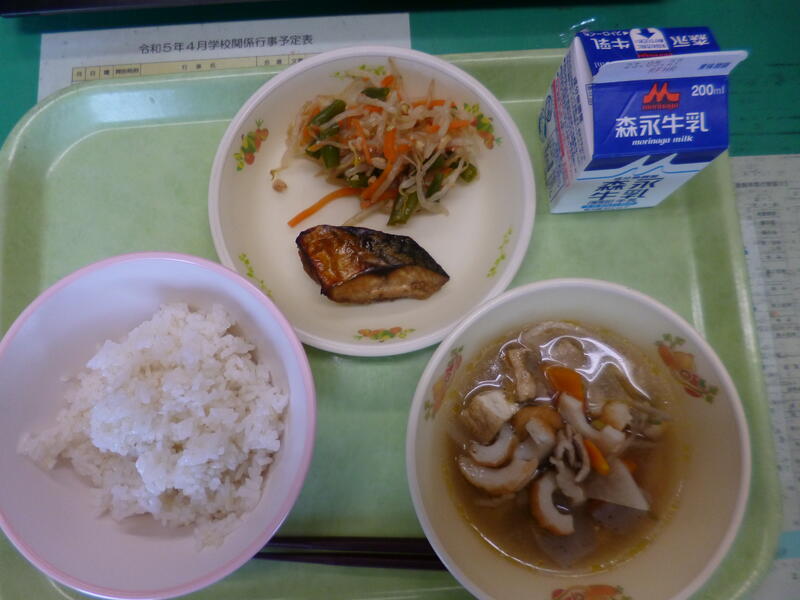 麦ごはん、牛乳、具沢山汁、サバのソース煮、もやしのアーモンド和え