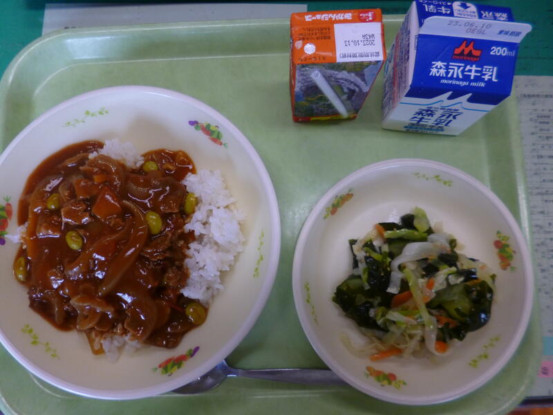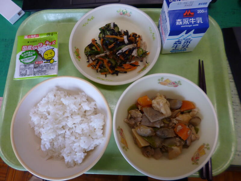 麦ごはん、牛乳、筑前煮、ひじきのサラダ、納豆