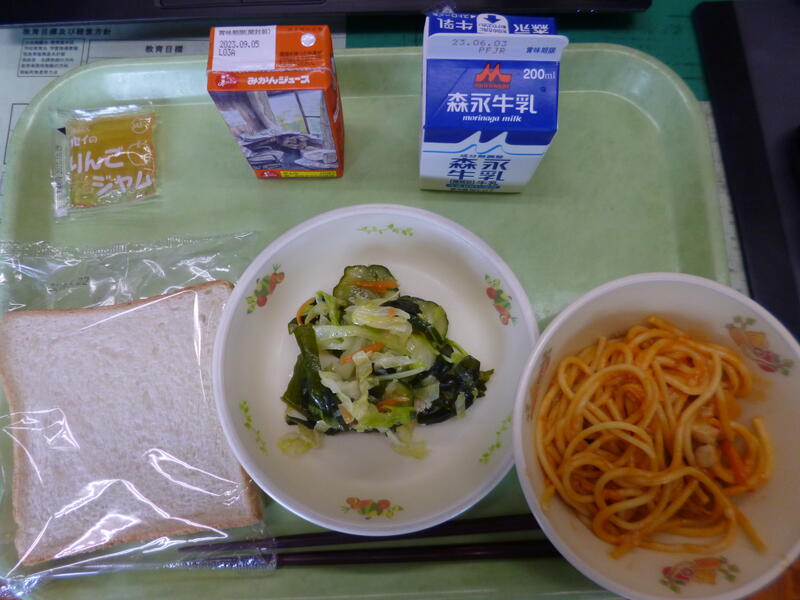 食パン、牛乳、トマトクリームスパゲティ、イタリアンサラダ、みかんジャム