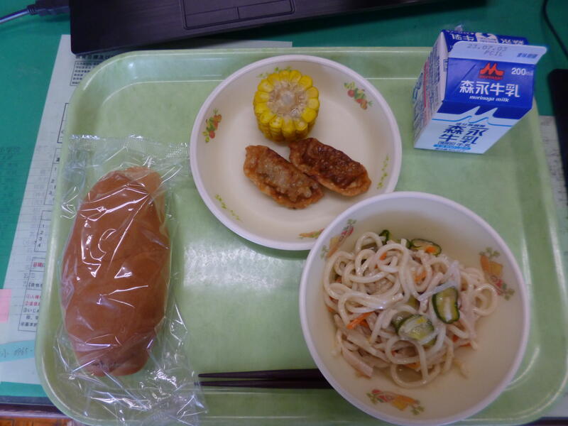 コッペパン、牛乳、冷やし中華、揚げ餃子、トウモロコシ
