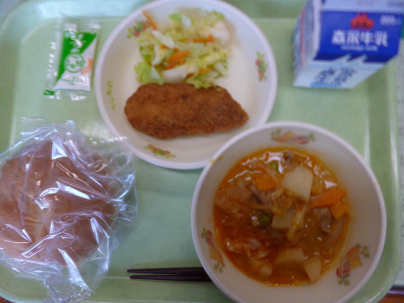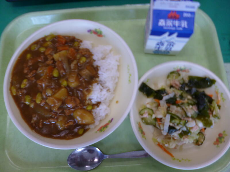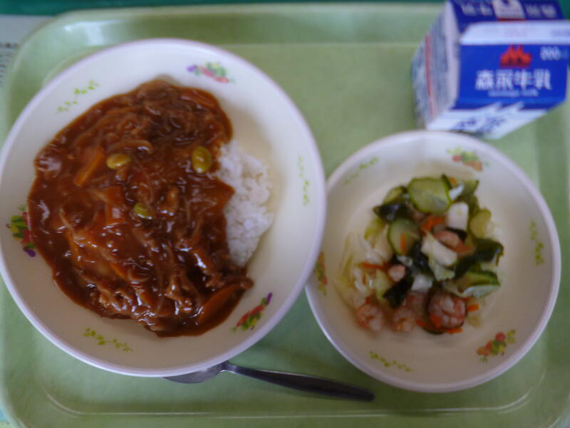 チキンカレーライス、牛乳、わかめとツナのサラダ