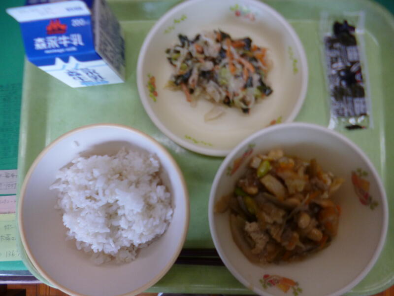 麦ごはん、牛乳、大豆の磯煮、御船川とささみのサラダ、味付け海苔