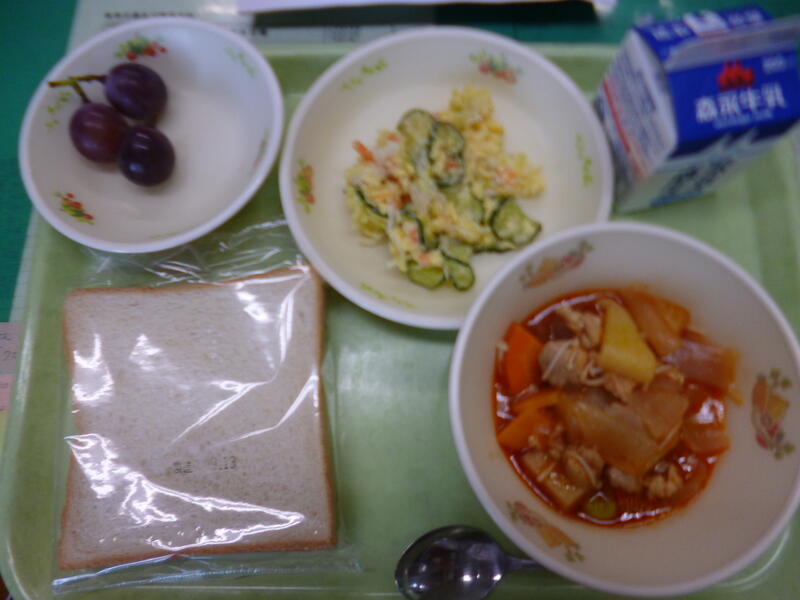 セルフサンドイッチ(卵サラダ)、牛乳、鶏肉のトマト煮、フドウ