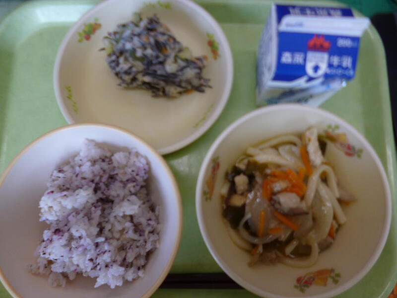 ゆかりごはん、牛乳、五目うどん、ひじきポテトサラダ