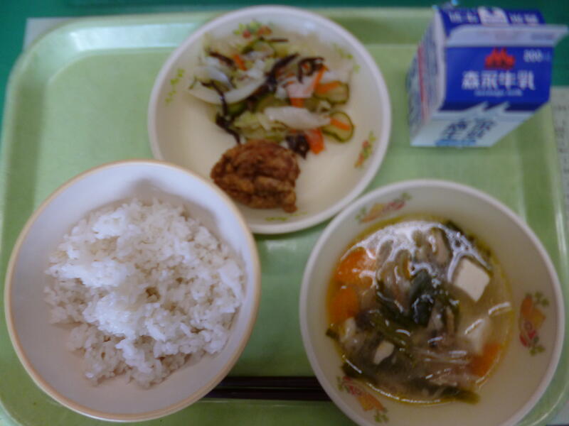 ふるさとくまさんデー ~人吉・球磨地域~ 麦ごはん、きのこと豆腐のスープ、鶏のから揚げ、きくらげの酢の物、牛乳