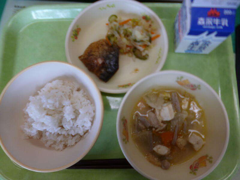麦ごはん、牛乳、根菜のごま汁、サバのソース煮、梅和え