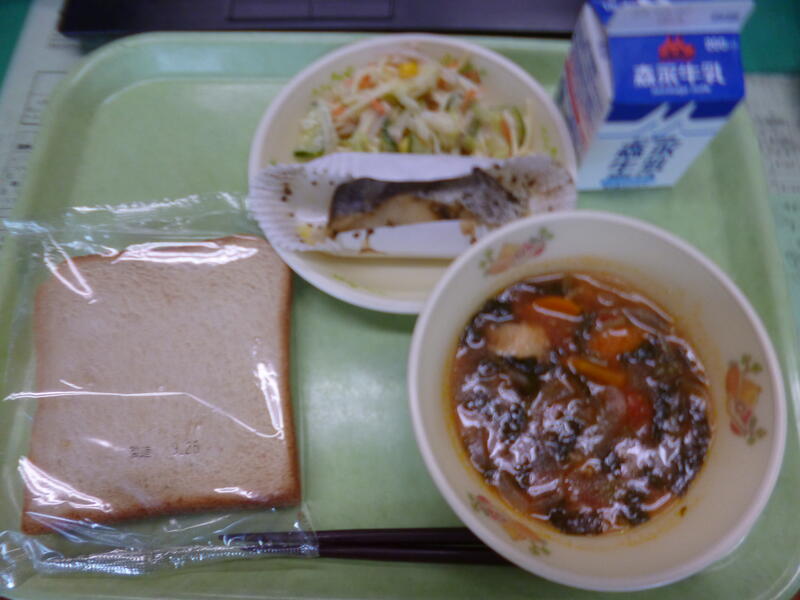 黒糖パン、牛乳、ミノストローネ、魚の香草焼き、スパゲティサラダ