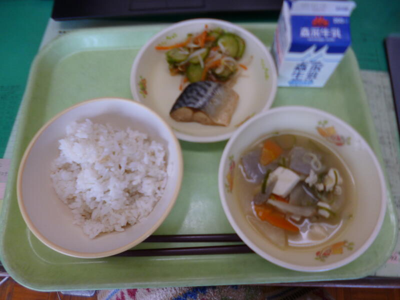 麦ごはん、牛乳、けんちん汁、鯖の煮つけ、ごま酢和え