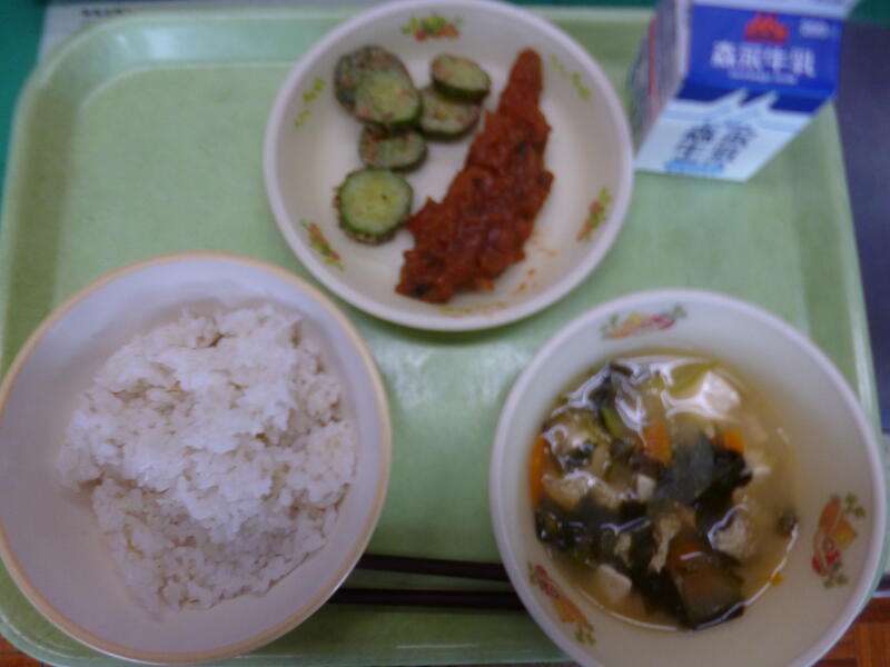 麦ごはん、牛乳、厚揚げのみそ煮、ひじきのサラダ