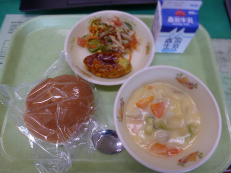 丸パン、牛乳、クリームシチュー、オムレツのケチャップソース、りっちゃんサラダ