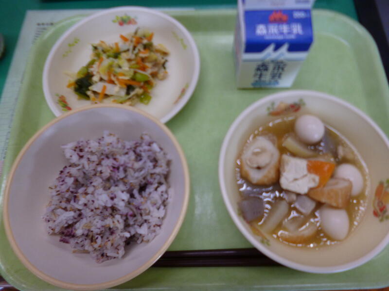 梅じゃこごはん、牛乳、おでん、菜焼き
